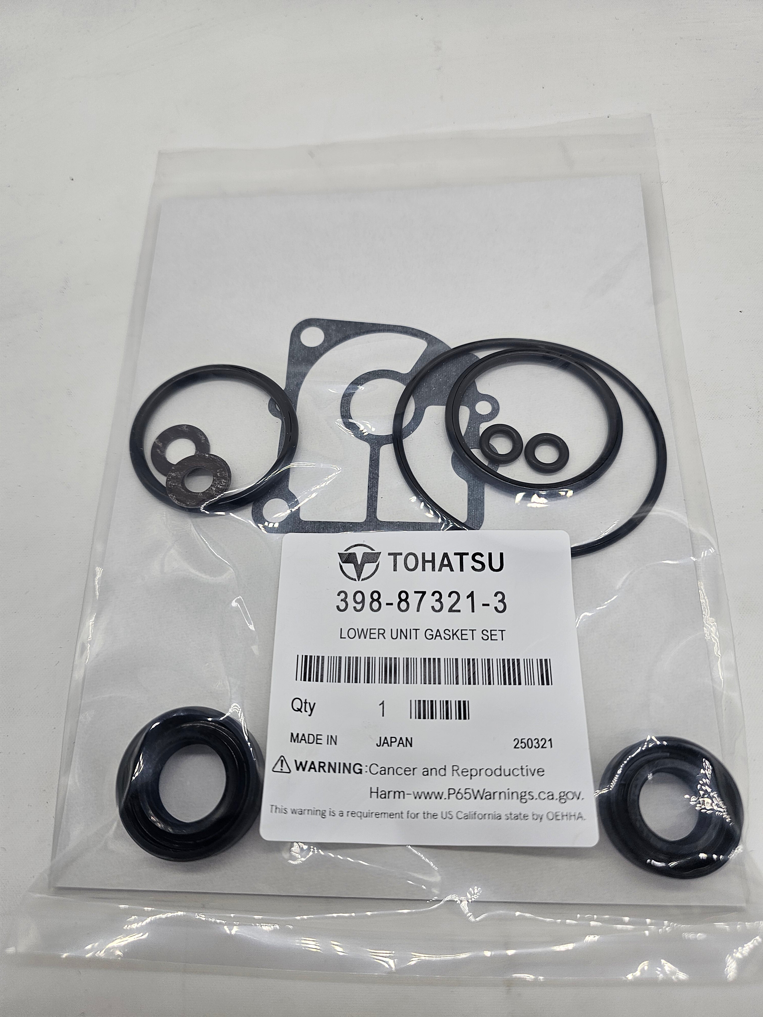 This genuine OEM Tohatsu lower unit gasket set is suitable for Tohatsu 15HP, 18HP, and 20HP 4-stroke carburetted outboards.